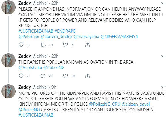 He allegedly threatened her and bundled her into the car. His driver then drove to Omole Estate where Babatunde allegedly raped Zainab all through the night. The following day, he dropped her by the road after threatening that her life would be in danger if she tells anyone, Zainab reportedly told her parents and the case was reported at the Olosan police station after which the victim was taken to the hospital for tests. She has now been placed on HIV drugs and other medications and the incident has left her depressed. It was also alleged that the police officers have been compromised due to the influence of the accused. Also, Zainab and her parents have allegedly received threats to force them to drop the case. The incident was narrated on Twitter by @ehival and the victim responded to back up the story. Zainab also thanked Twitter users for their support and added that her hope is that she can "recover from this trauma." Read the tweets narrating the incident below.