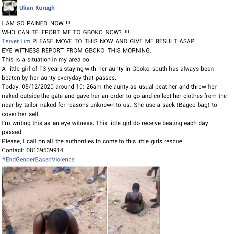 According to Ukan Kurugh, the girl had to use a sack to cover herself after the woman threw her out and ordered her to go get collect some clothes from a tailor. The report below: "This is a situation in my area oo. A little girl of 13 years staying with her aunty in Gboko-south has always been beaten by her aunty everyday that passes. "Today, 05/12/2020 around 10: 26am the aunty as usual beat her and throw her naked outside the gate and gave her an order to go and collect her clothes from the near by tailor unclad for reasons unknown to me. She has nothing on her and use a sack (Bagco bag) to cover her self. I'm writing this as an eye witness. Please, I call on all the authorities to come to this little girl's rescue.Contact: 08139539914#EndGenderBasedViolence
