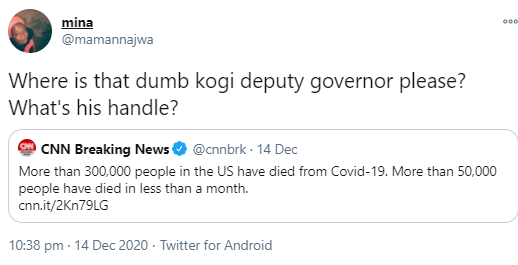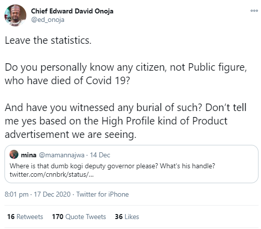 Kogi Deputy Governor, Edward David Onoja has continued to deny that Covid-19 is a threat in Nigeria and he took to Twitter to question its existence. A Twitter user had shared CNN's tweet that over 300,000 people have died from Covid-19 in the US. She captioned the tweet: "Where is that dumb kogi deputy governor please? What's his handle?"