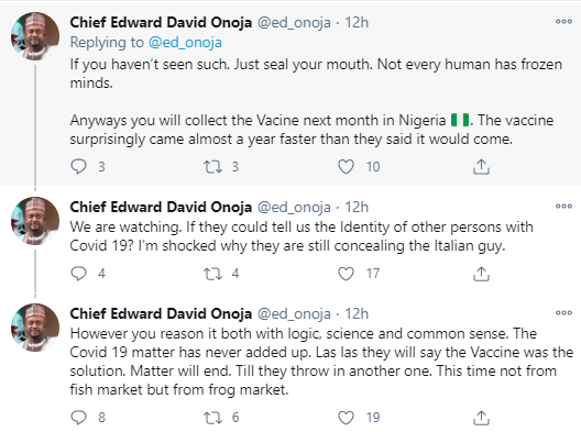 "If you haven’t seen such. Just seal your mouth. Not every human has frozen minds. Anyways you will collect the Vacine next month in Nigeria. The vaccine surprisingly came almost a year faster than they said it would come. "We are watching. If they could tell us the Identity of other persons with Covid 19? I’m shocked why they are still concealing the Italian guy. "However you reason it both with logic, science and common sense. The Covid 19 matter has never added up. Las las they will say the Vaccine was the solution. Matter will end. Till they throw in another one. This time not from fish market but from frog market."