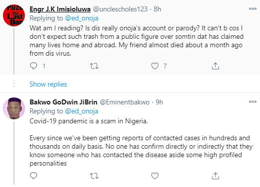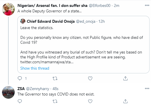 And Onoja responded: "Leave the statistics. Do you personally know any citizen, not Public figure, who have died of Covid 19? And have you witnessed any burial of such? Don’t tell me yes based on the High Profile kind of Product advertisement we are seeing.