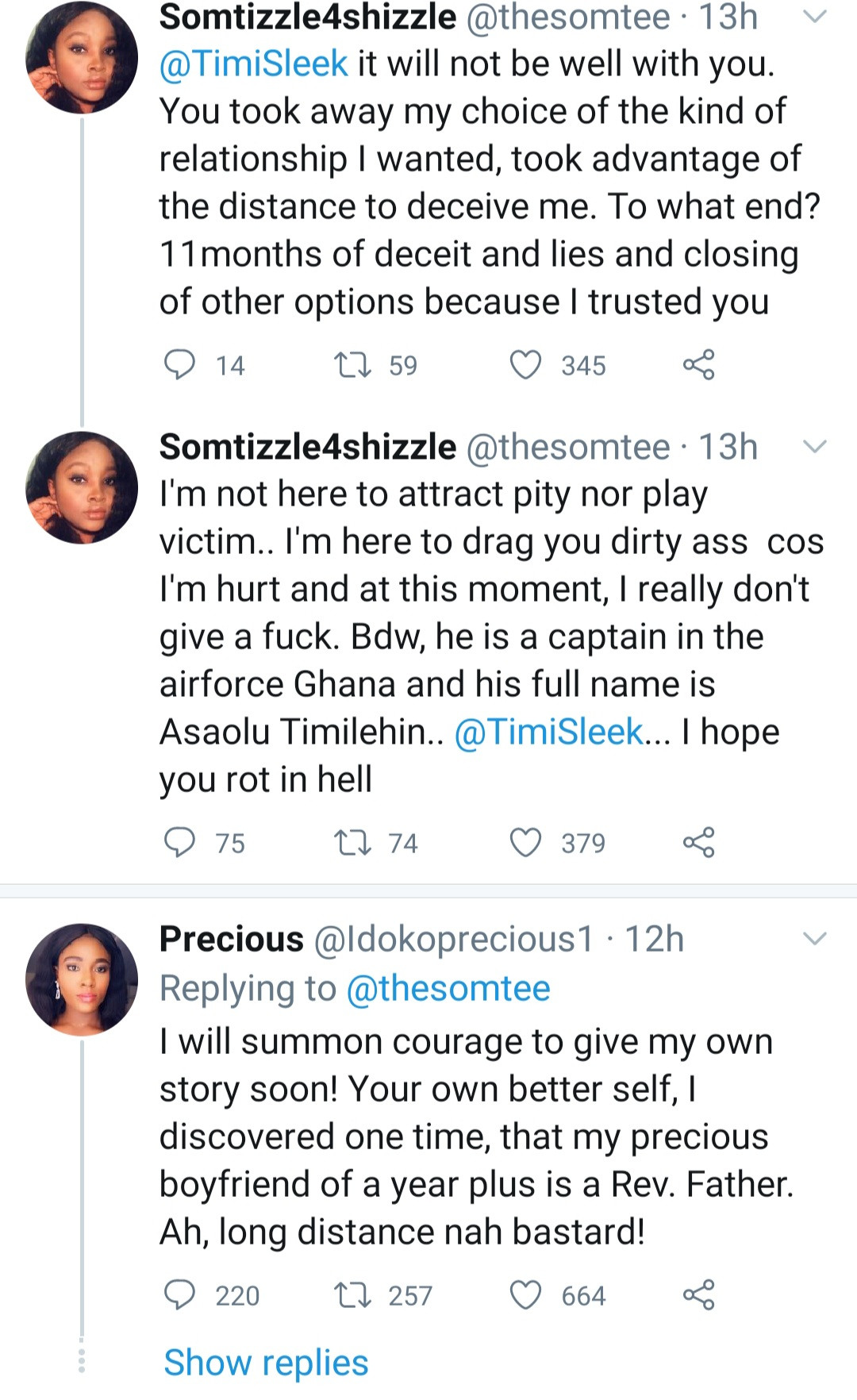 A woman took to Twitter to name and shame her boyfriend after she discovered he is married with kids and lied the woman was his sister. Twitter user @thesomtee revealed she got to know Asaolu Timilehin through a mutual friend in January 2020 and they began chatting frequently. He claimed he wanted a serious relationship because he had been badly hurt in the past and didn't want to go down that road again. He also claimed he was single. Somtee said they started dating in February but it was long distance because he lives in Ghana. She planned to go to Ghana in March but the lockdown happened. She eventually visited him in October and said their relationship was going well. Until she started noticing some suspicious texts. When she questioned him, he claimed the woman is his sister with kids who lives with him. She accepted it but later became suspicious again and he later said she's his baby mama and only one of the kids is his. He claimed there's nothing between them and he's just helping her out. Somtee said she was no longer comfortable at this point so she returned to Nigeria. Back in Nigeria, she discovered Timilehin is married to the woman and both kids are his. She also discovered he has multiple other woman he has deceived in the same way, claiming he's single. Timilehin has deactivated his Twitter account following the call out. Read Somtee's narration below.
